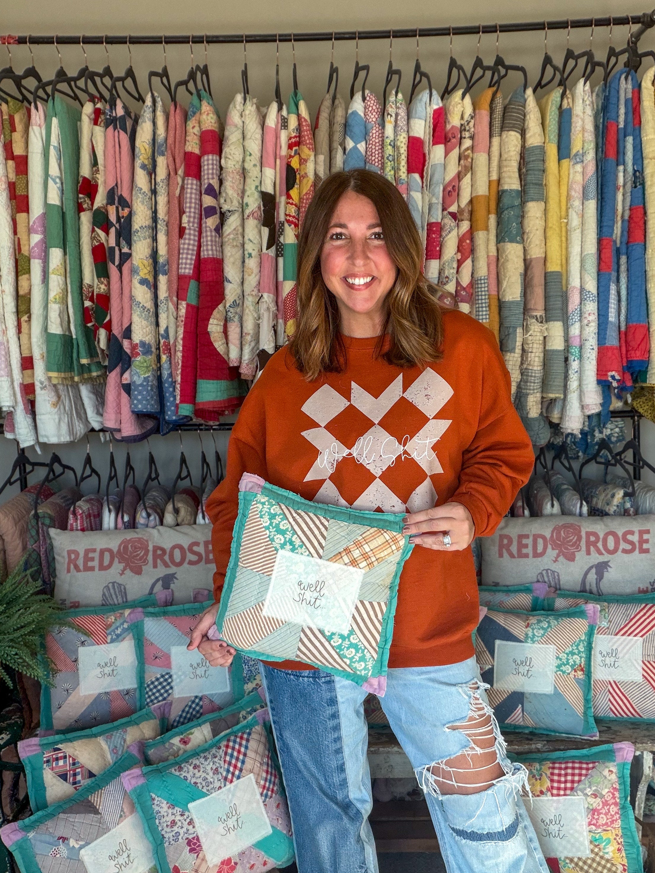 Hi! I'm Blair. I'm a wife, momma, picker, and quilt hoarder... I mean collector. I currently have over 300 quilts, but who's counting (except my husband). I love all things old, worn, weathered, rusty, and crusty. I haven't always been into sewing, I learned from my big sis about 10 years ago and now I make pillows for a living. Who would've thought it? Now I can't see myself doing anything else. This job gives me the freedom to be everything my kids need and support my family at the same time. It gives me great joy to take these old, worn textiles and give them a new life.