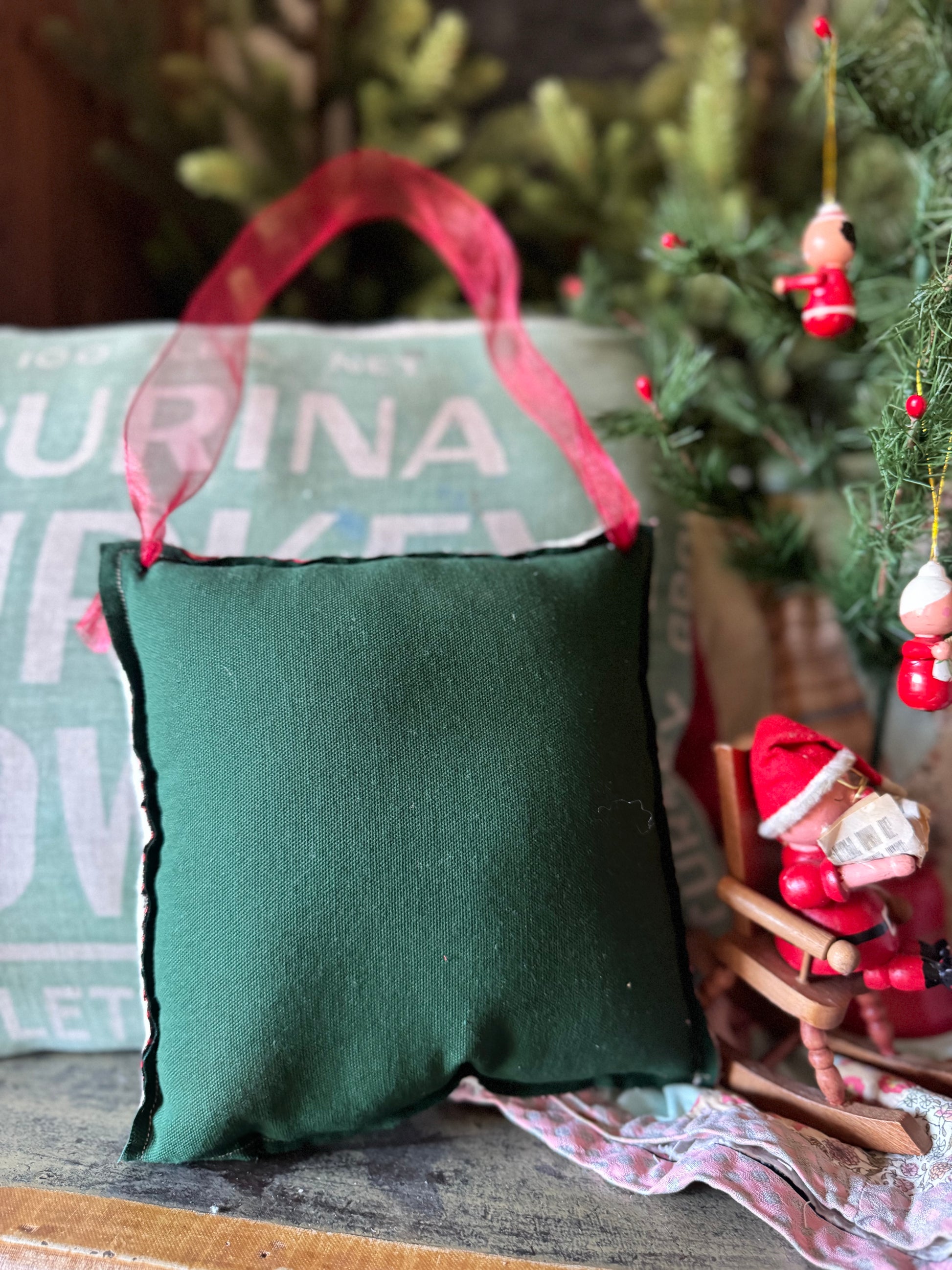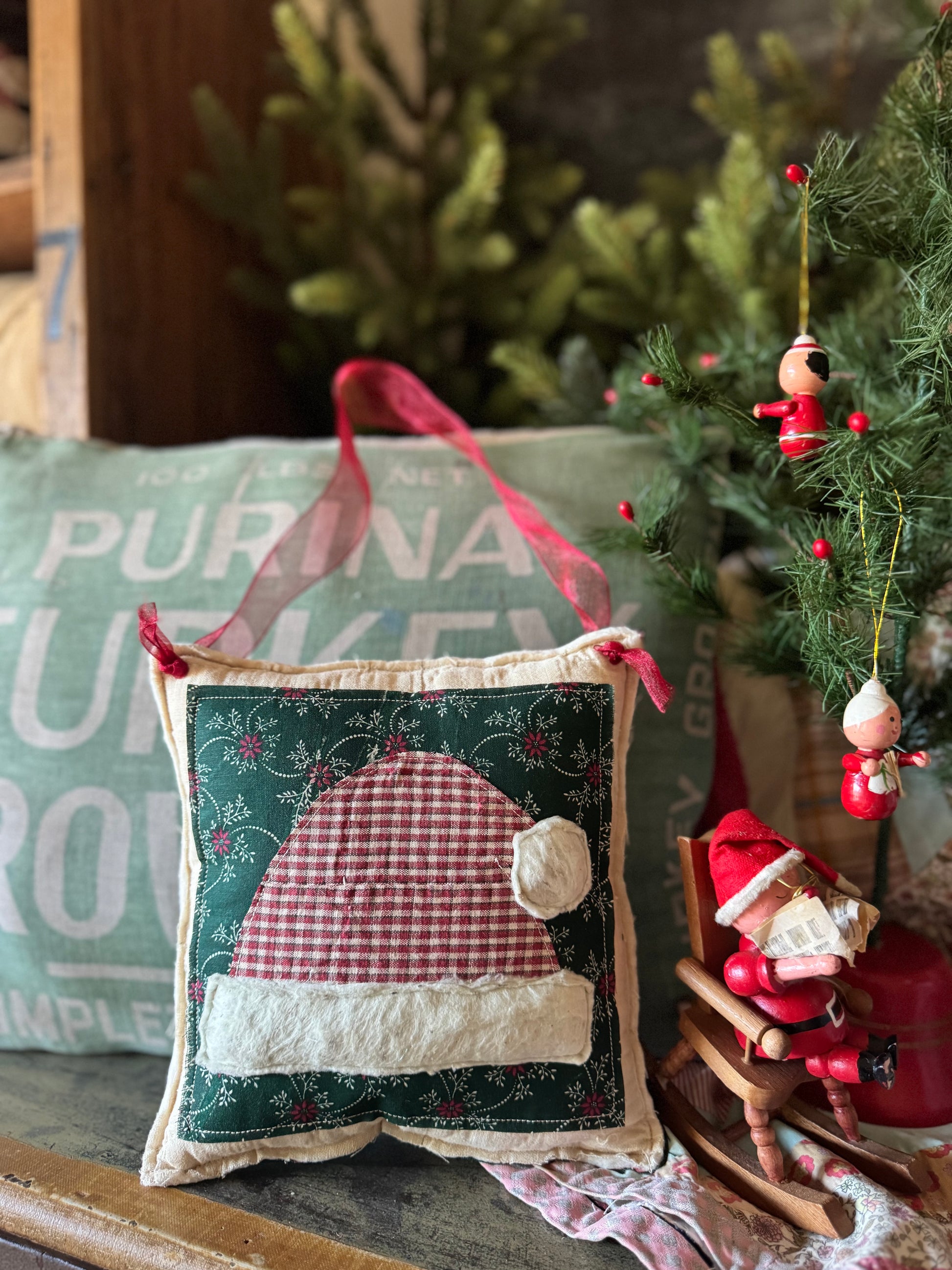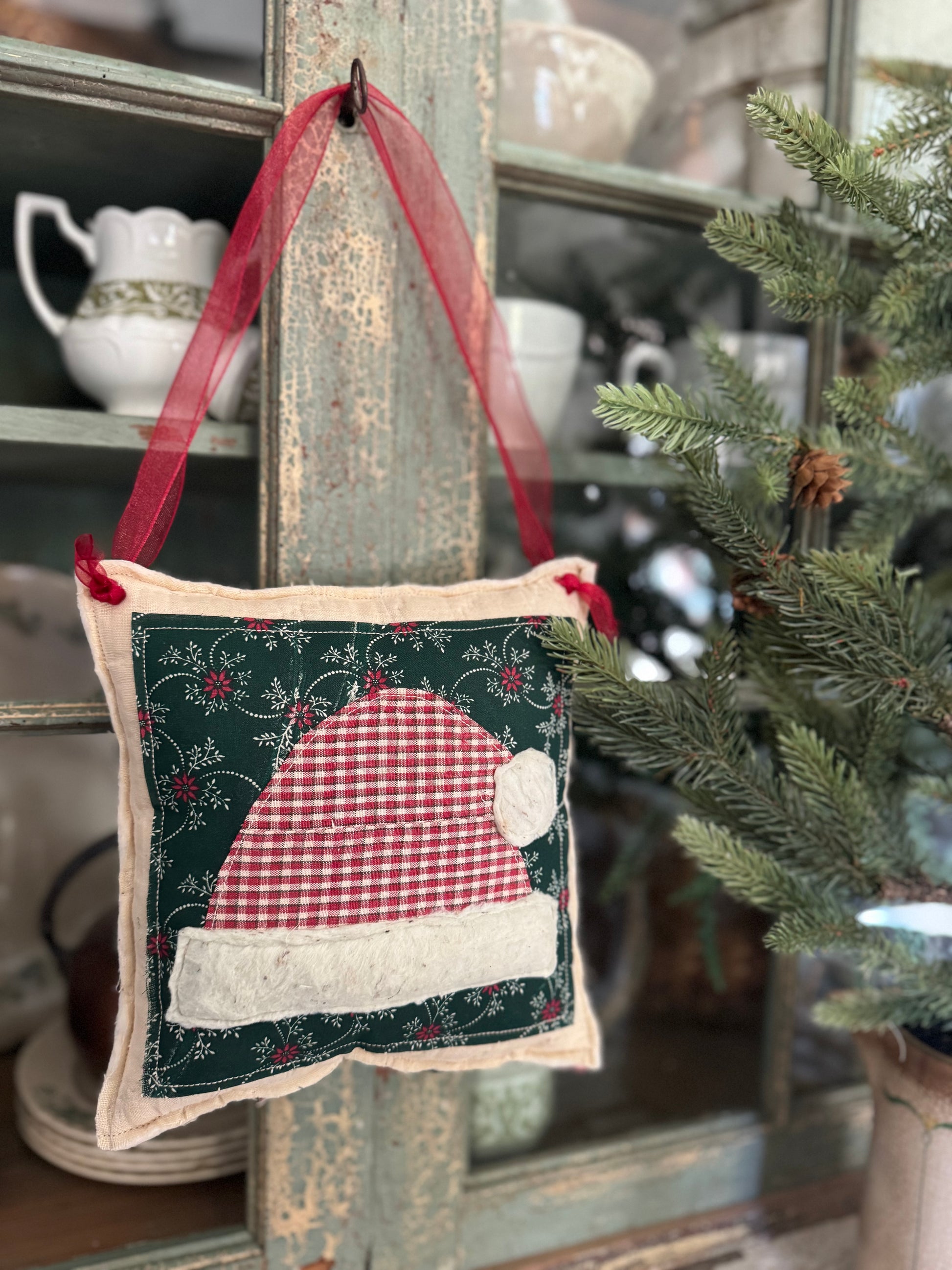 The front is made from a vintage or antique cutter quilt. Layered with vintage Christmas material. Featuring a hand made Santa hat, made from quilt scraps and quilt batting. Comes ready to hang with red ribbon. The back is green canvas material.