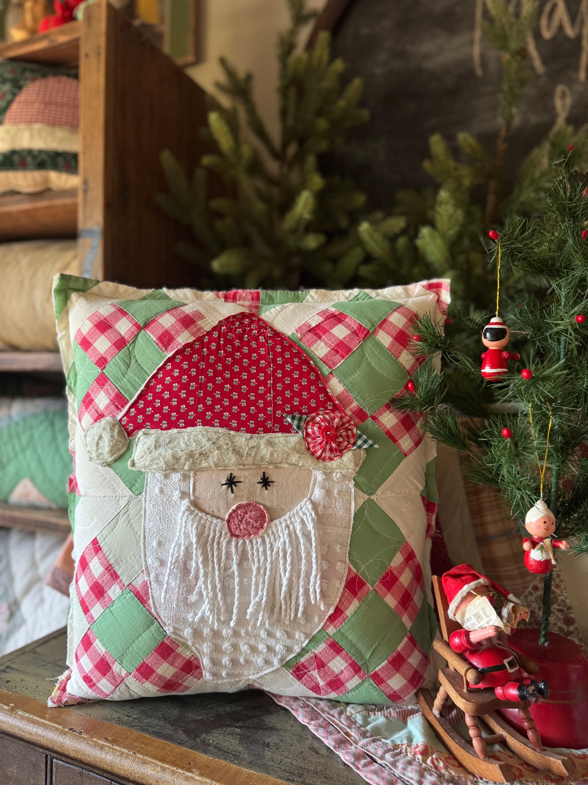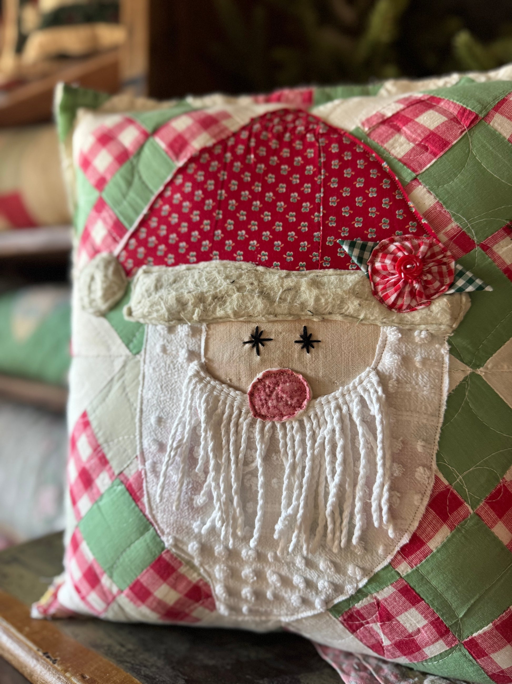 The front is made from a vintage or antique cutter quilt. Featuring a handmade Santa face. Santa is made from quilt scraps, a vintage chenille bedspread, quilt batting, and a vintage fabric yo-yo flower, with hand stitched eyes. The back is coordinating Santa fabric