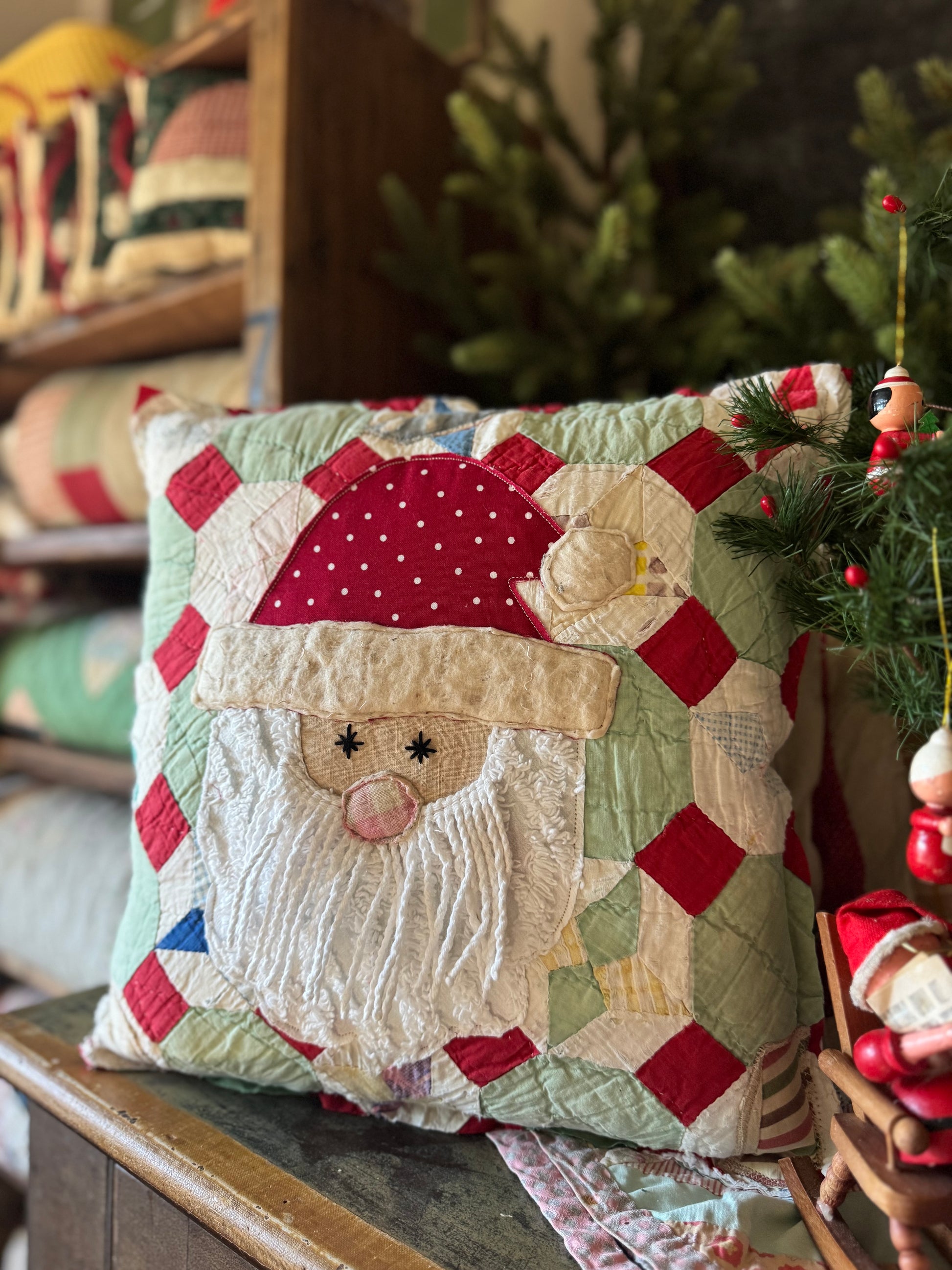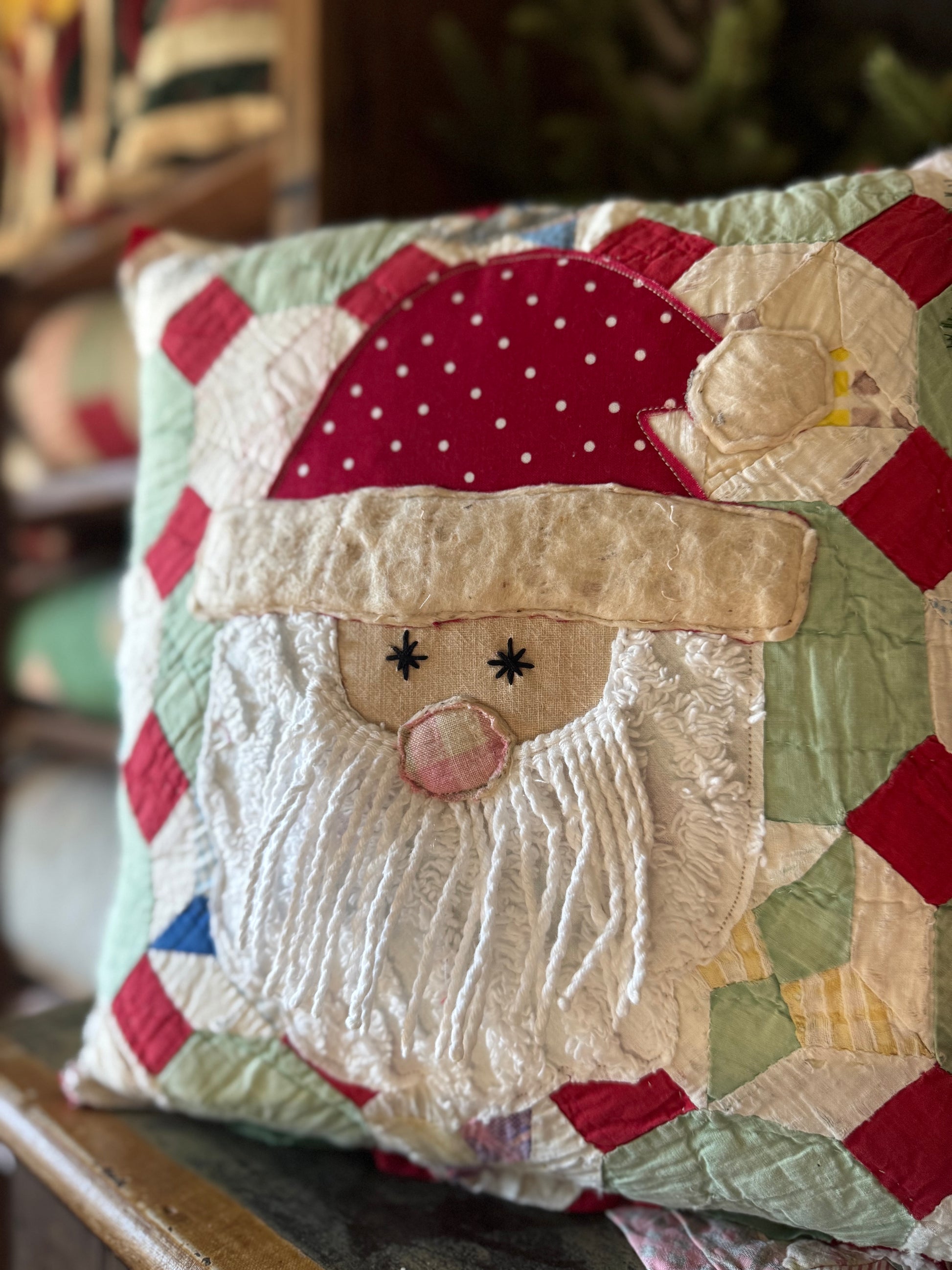 The front is made from a vintage or antique cutter quilt. Featuring a handmade Santa face. Santa is made from quilt scraps, a vintage chenille bedspread, quilt batting, with hand stitched eyes. The back is coordinating Santa fabric