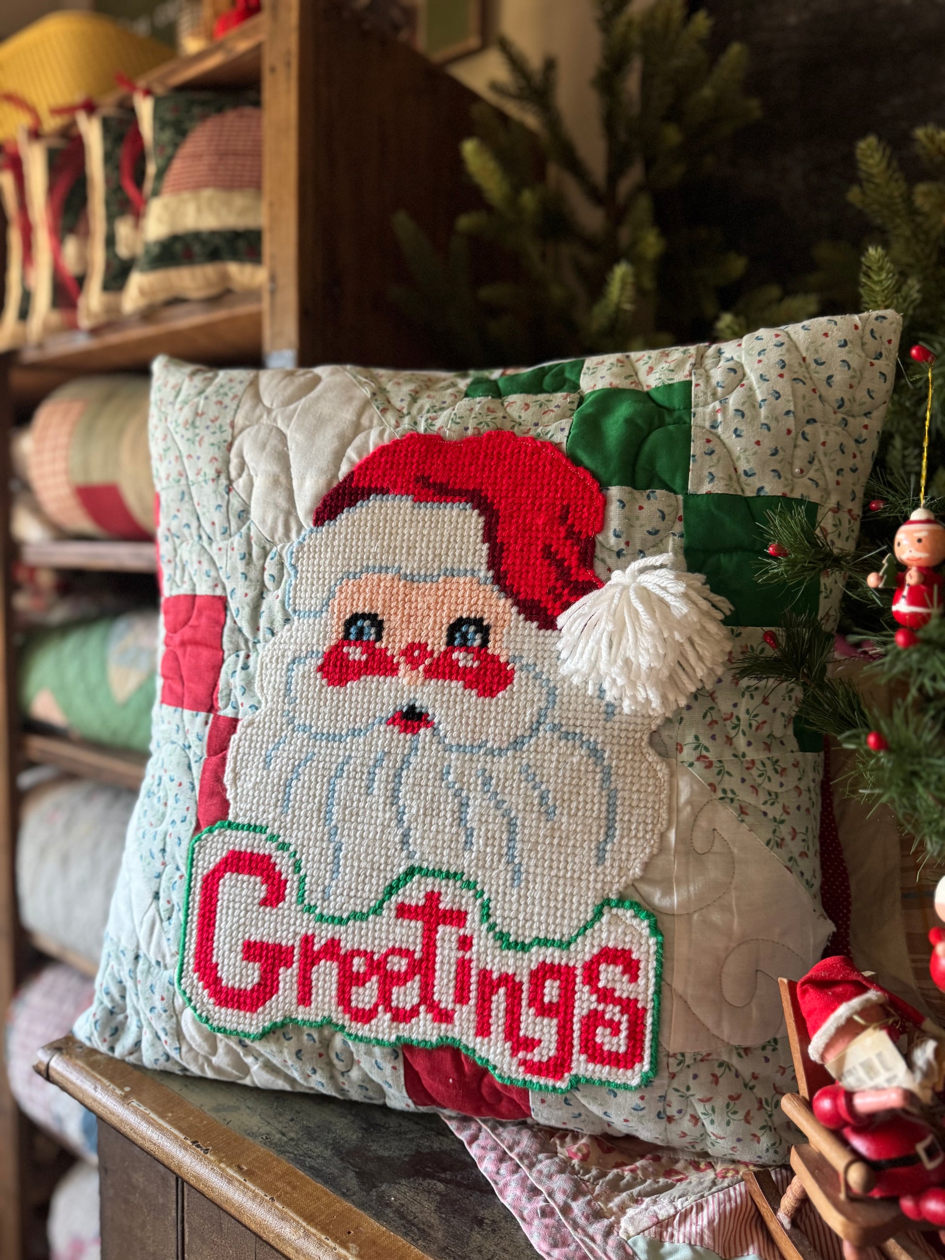 The front is made from a vintage quilt. Featuring the cutest vintage needlepoint Santa face. The back is coordinating Santa material.