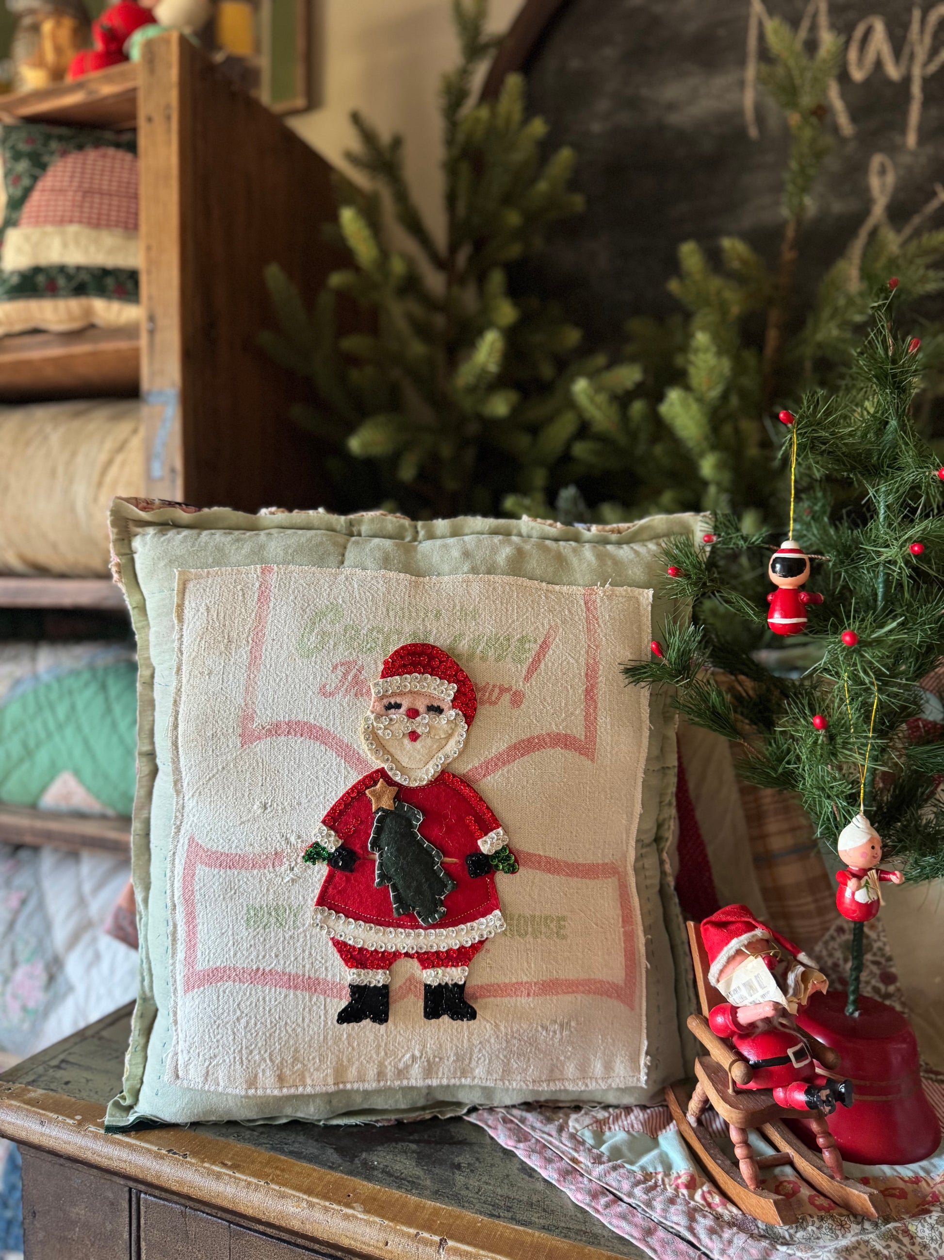 The front is made from the back of a vintage or antique cutter quilt. Layered with feedsack fabric. Featuring a handmade vintage Santa. The back is green canvas material.